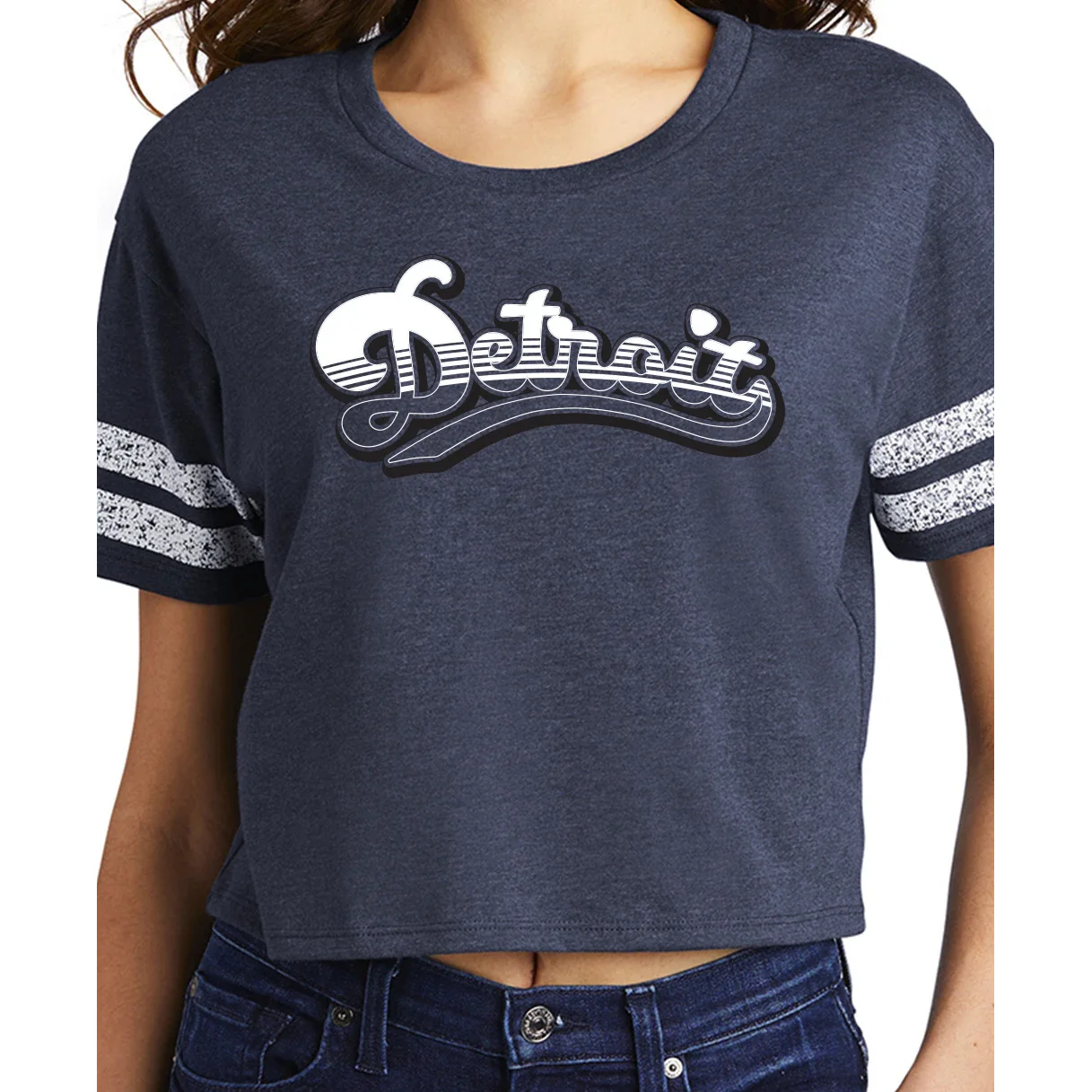 Get a relaxed, throwback look in the Made in Detroit Cheers to Detroit Womens T-shirt. This shirt has a crop style and features some cool looking distressed printed stripes on the sleeves. Show your love for Detroit in this snazzy looking tee.